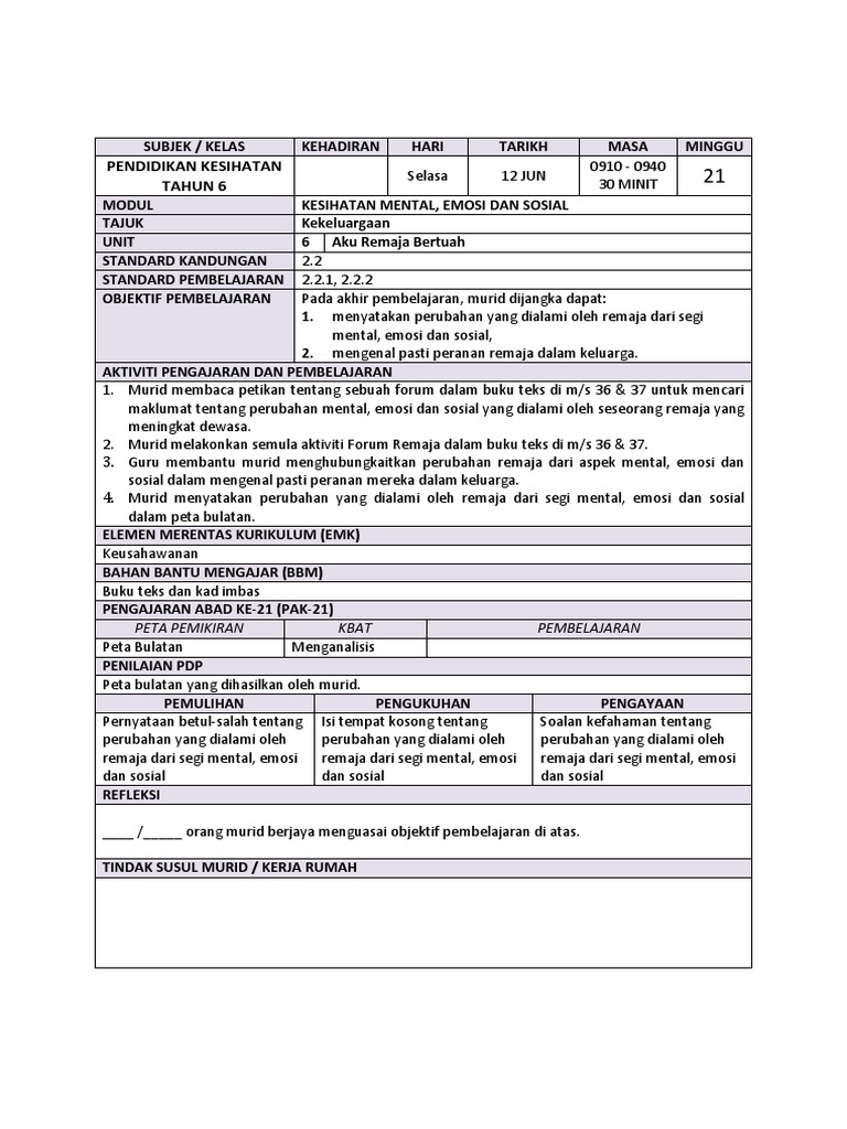 Mata pelajaran rph mata pelajaran pendidikan kesihatan kelas 4 ken tema / tajuk pengurusan mental dan emosi tarikh 23 jun 2015 masa 12.30 tengah hari â 1.00 tengah hari…